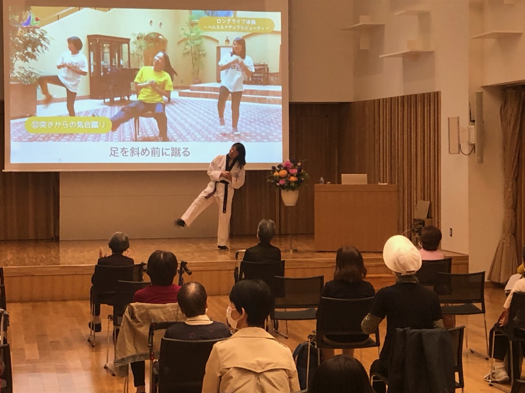 講師は、シドニー五輪テコンドー銅メダリスト岡本依子さん(ロングライフホールディング株式会社ヘルス&スポーツ部門エグゼクティブマネジャー)が努め、ロングライフグループ全体で取り組んでいるプログラム、ヘルス&ナチュラルビューティのロングライフ体操を解説、会場にお越しくださった皆様とご一緒に実践しました。