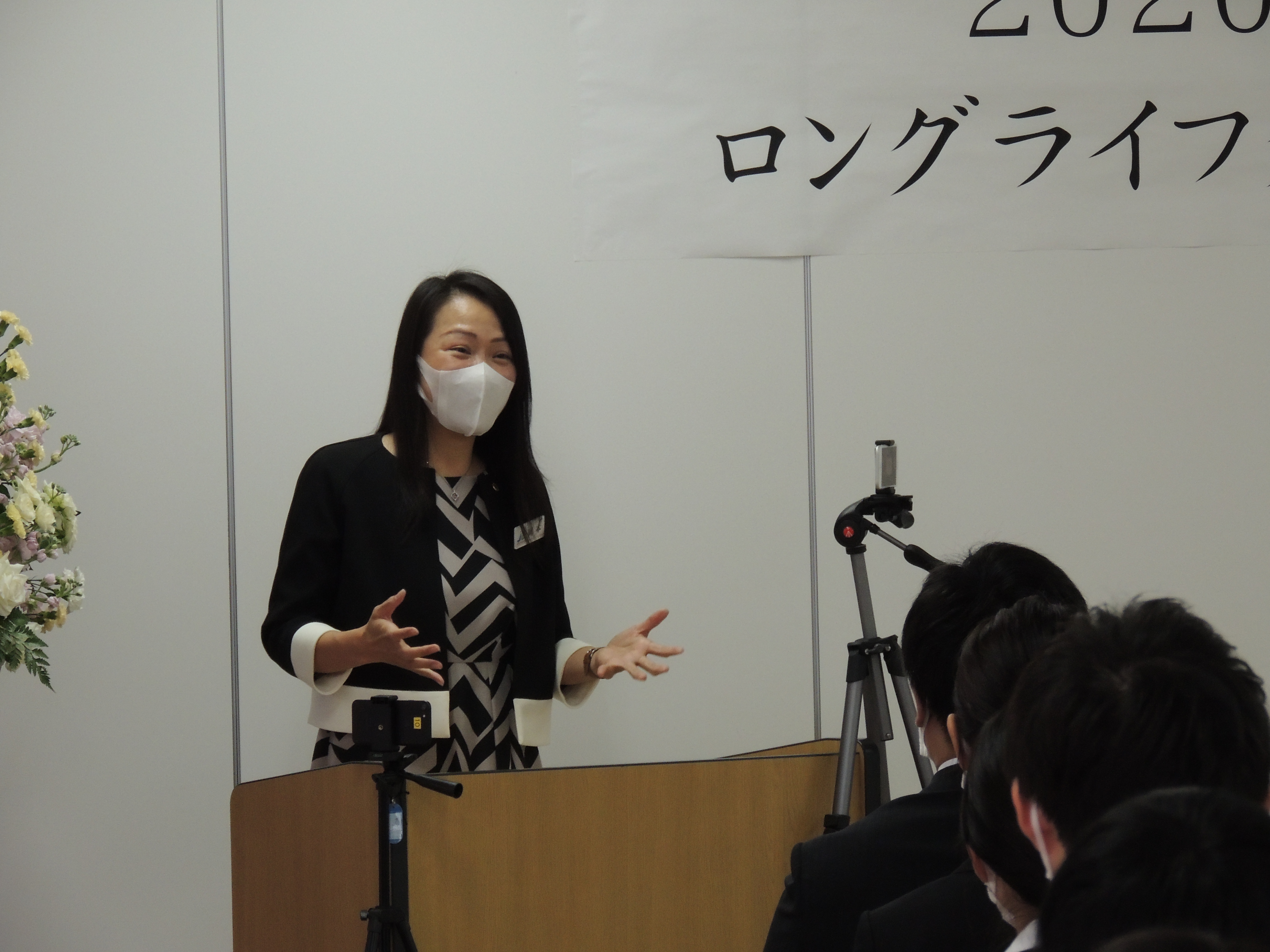 始めに、キリスト教牧師でもあるシドニー五輪テコンドー銅メダリスト岡本依子さん、当社の代表取締役社長桜井ひろみをはじめグループ各社役員からのメッセージと、ロングライフ顧問を務めていただいているお客様、先輩社員からのビデオメッセージを贈りました。