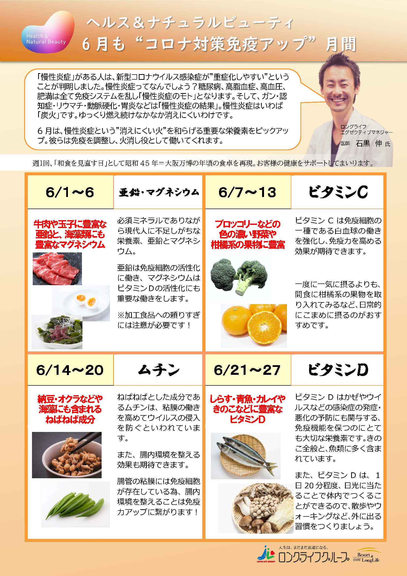 6月も引き続き『新型コロナウイルス感染症対策』をテーマに、免疫力を高める栄養素を石黒先生にピックアップしていただき、このアドバイスをもとにロングライフダイニングの管理栄養士が献立作りを行います。当グループでは、ホームにご入居のお客様においしさと栄養面を両立したお料理をご提供することで、お客様の健康維持に一層力を入れて参ります。