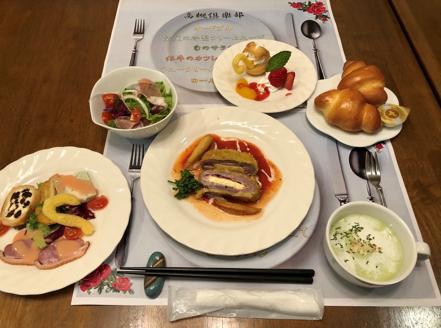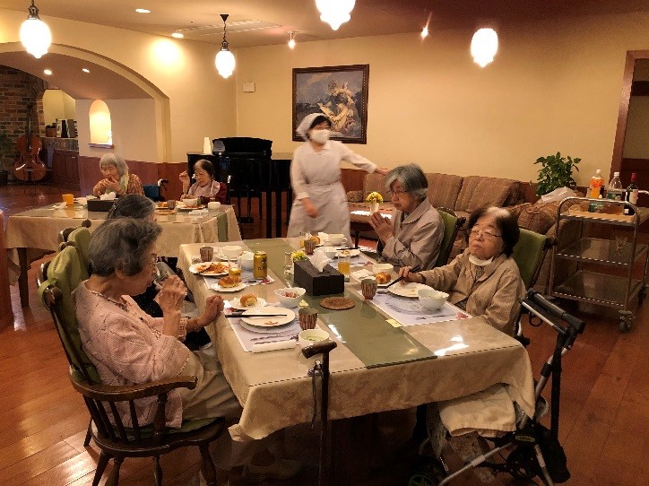 当社の連結子会社である日本ロングライフ株式会社が運営する介護付有料老人ホーム「ロングライフ高槻」にて5月22日、金曜日の夜に豪華なディナーをお楽しみいただく「高槻クラブ」を開催しました。今回はフレンチのコースで、空豆の冷製スープや仔牛のヒレカツ、スワンのシュークリームなどシェフこだわりのメニューをご用意しました。また、5月のお誕生日のお客様3名にホーム長からバラのお花をプレゼントさせていただき、素敵なひと時をお過ごしいただきました。