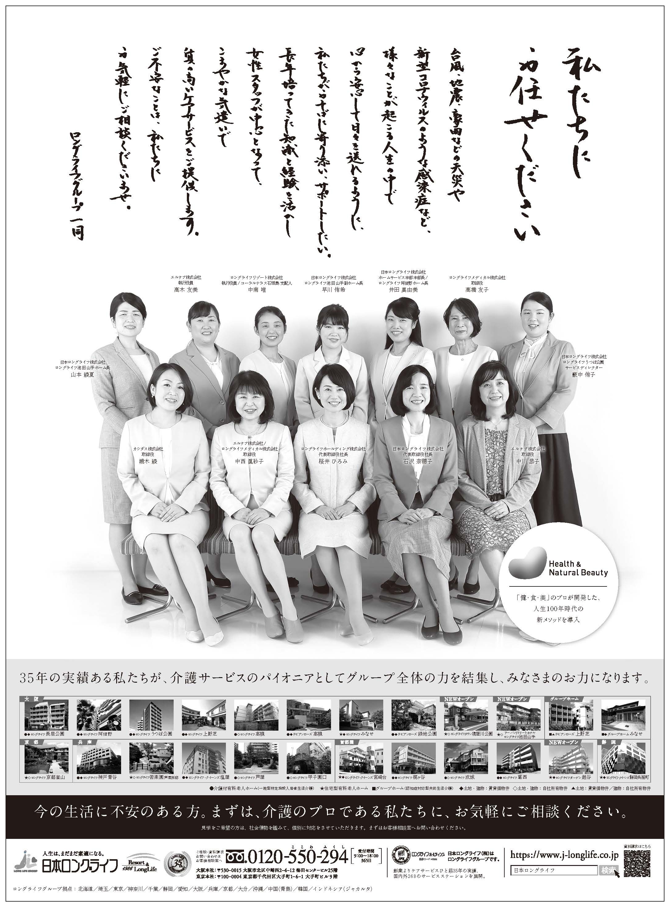 当社代表取締役社長の桜井ひろみによる手書きメッセージと、当グループの女性役員らの集合写真を掲載し、女性目線のきめ細やかなケアサービスのご提供を訴える内容となっております。