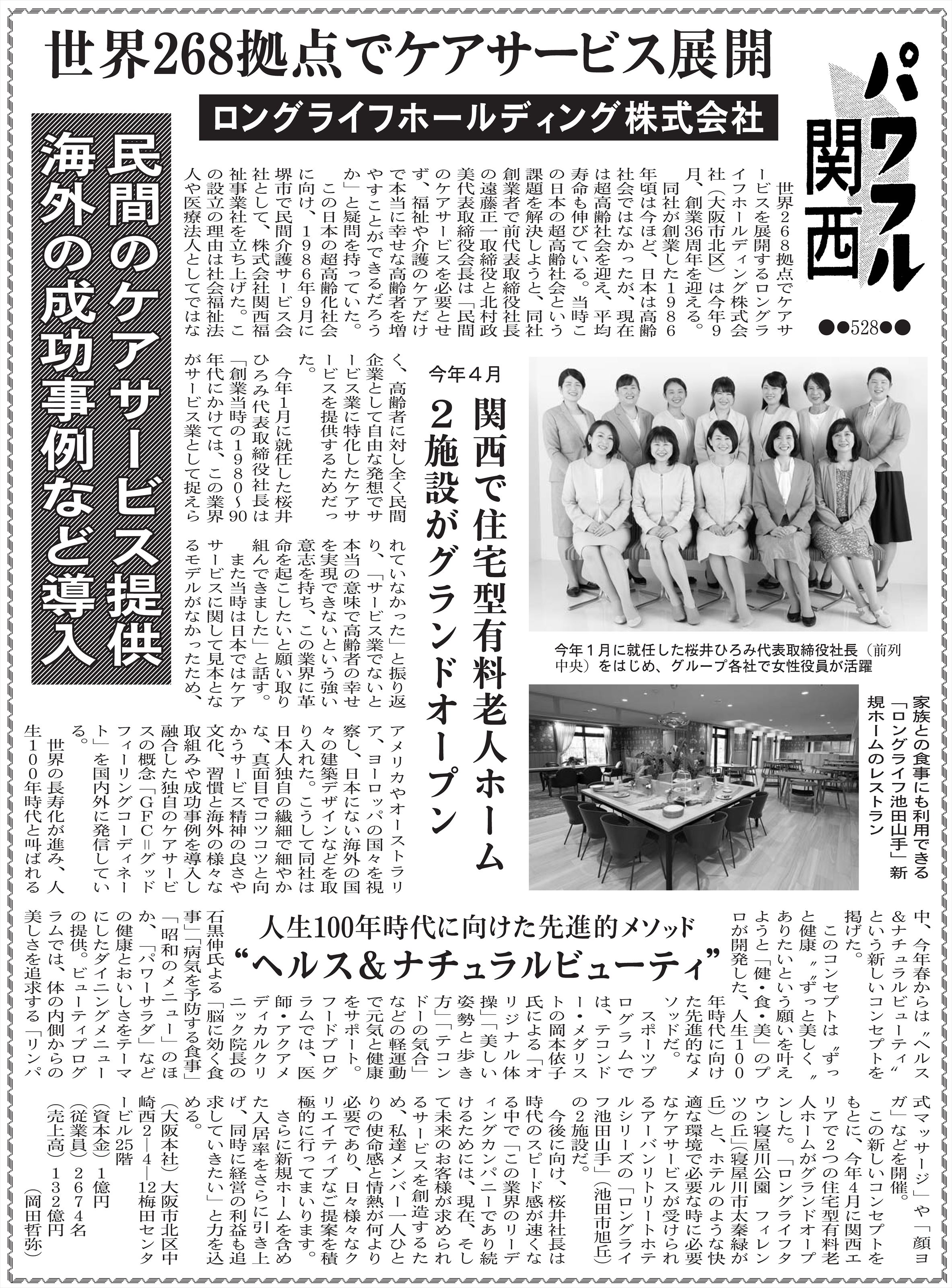 事前に行われた当社代表取締役社長の桜井ひろみへのインタビューをもとに、ロングライフグループの成り立ちや女性役員の活躍、新規ホームの特徴などが写真とともに紹介されています。