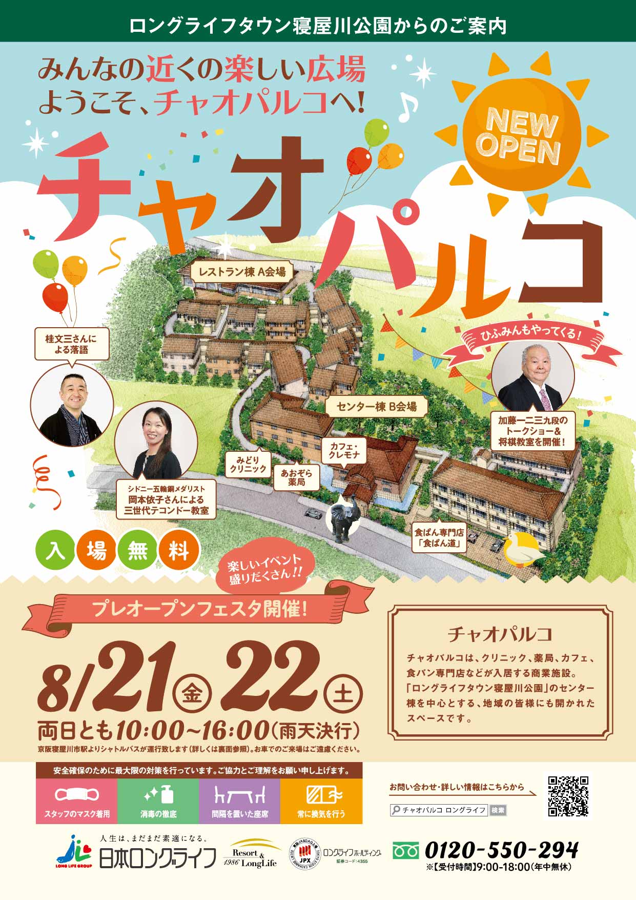 当社のグループ会社である日本ロングライフ株式会社が今年4月からオープン致しました住宅型有料老人ホーム「ロングライフタウン寝屋川公園」の商業施設「チャオパルコ」プレオープンフェスタに、ひふみんさん(加藤一二三九段)がお越しになる予定です。(万全のコロナ感染予防対策は行いますが、状況により、オンラインでご登場いただく可能性もございますので、あらかじめご承知おきください。)