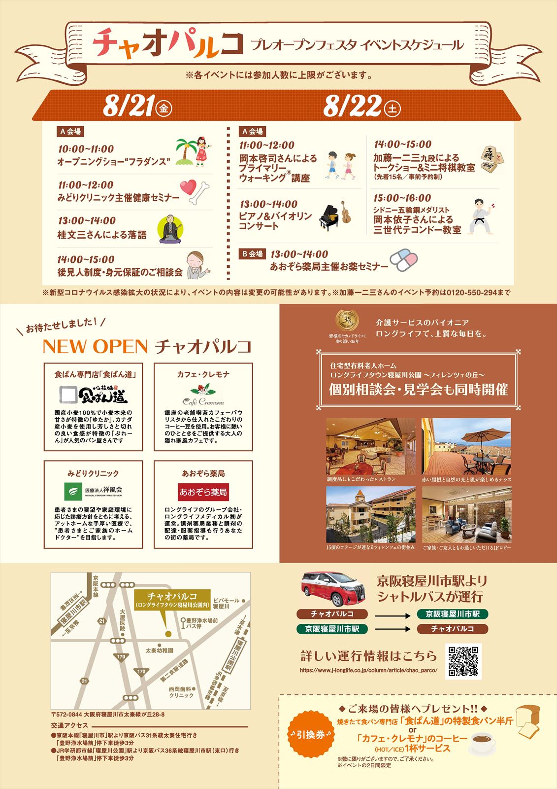 ロングライフタウン寝屋川公園のセンター棟を中心に外部に面している商業施設「チャオパルコ」は、クリニック、薬局、カフェ、食パン専門店などが入居しており、地域の皆さまとの交流の場となることを目的としたスペースですので、どなた様もプレオープンフェスタにお越しくださることを大歓迎致します。