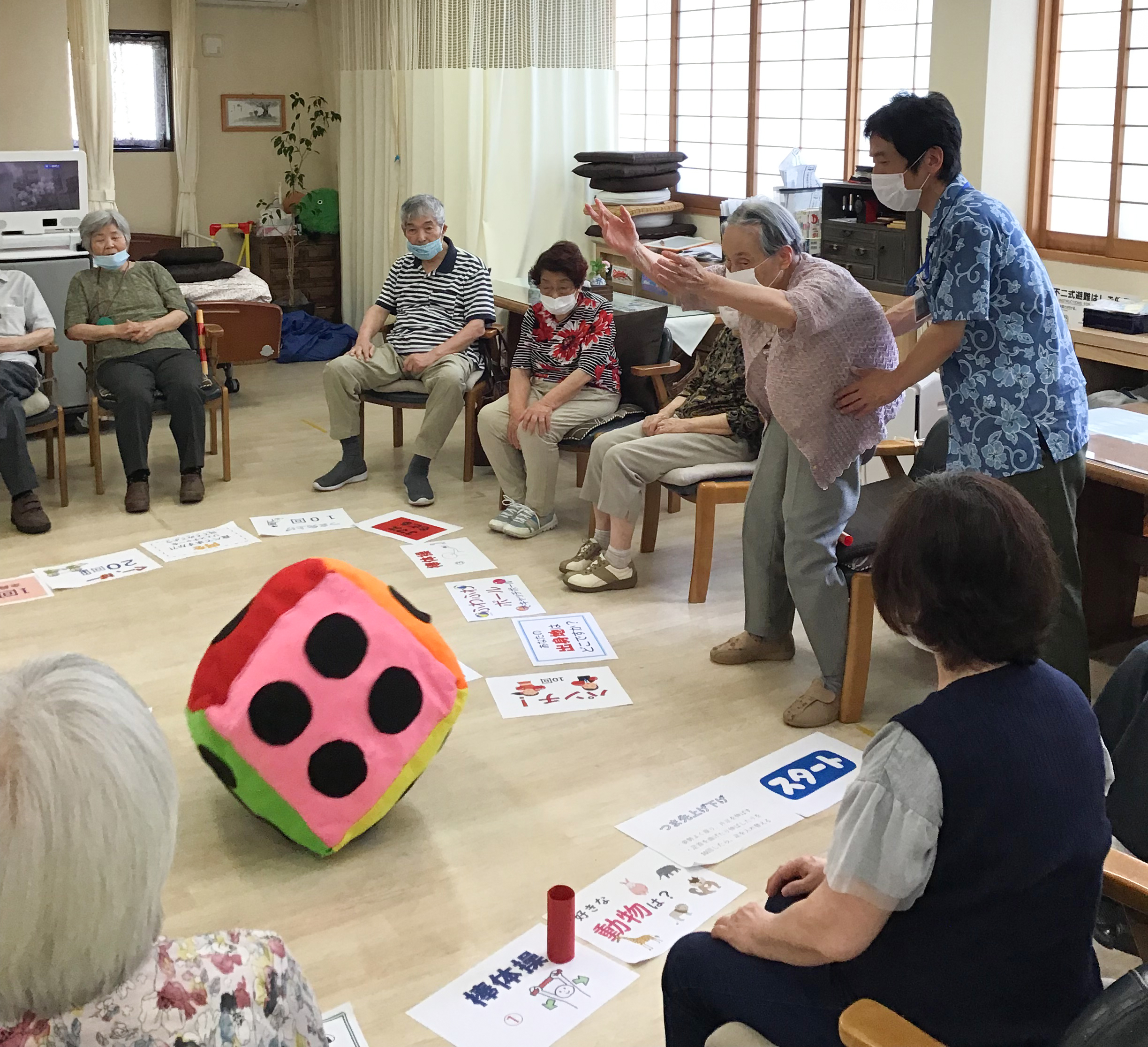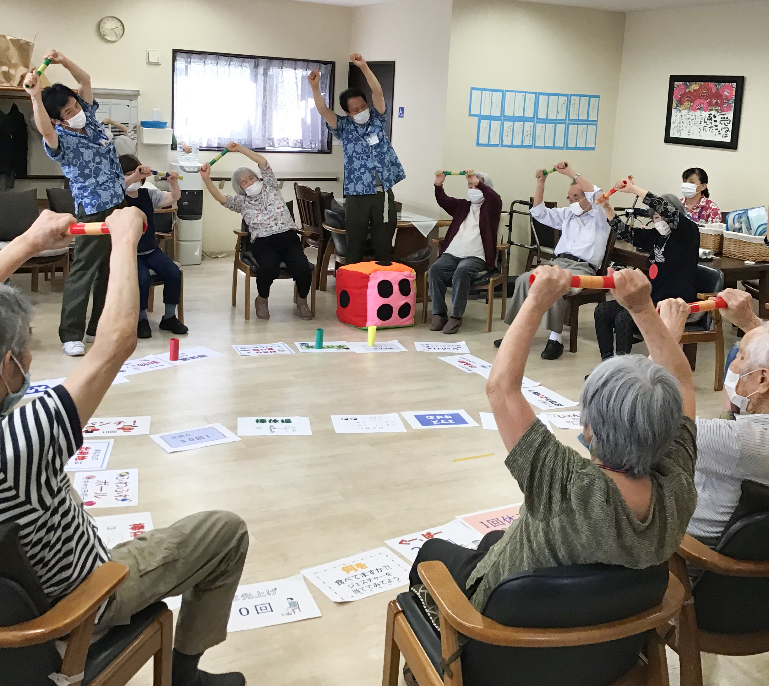 当社のグループ会社であるエルケア株式会社が運営する「デイサービスみなせ」で、ジャンボすごろくを開催しました。すごろくのマスには「足の体操」、「棒をつかったストレッチ運動」、「過去の体験を話す回想法」、「ジェスチャーゲーム」などのバラエティに富んだお題が書いてあり、楽しみながらご参加いただけます。また、大きなサイコロを振ることで軽い運動にもなり、お客様から好評のレクリエーションとなっています。
