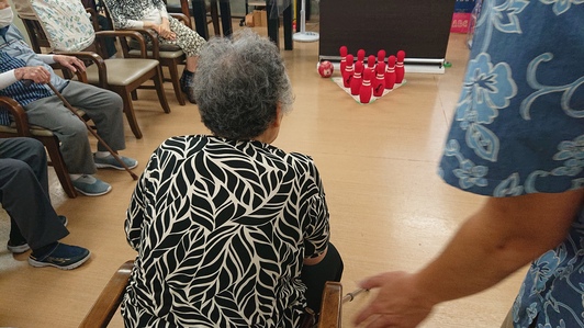 デイサービス堺には介護度の高いお客様が多く、座ったままできるボーリングは全員で楽しむことができますため、大変、喜ばれています。また、重たいボールをまっすぐに投げる動作は楽しみながらもリハビリになります。ストライクやスペアを出すと、コーヒー券などの賞品がもらえることも魅力のひとつです。昔、ボーリングをしていたのか、かなりお上手な方もいらっしゃいます。