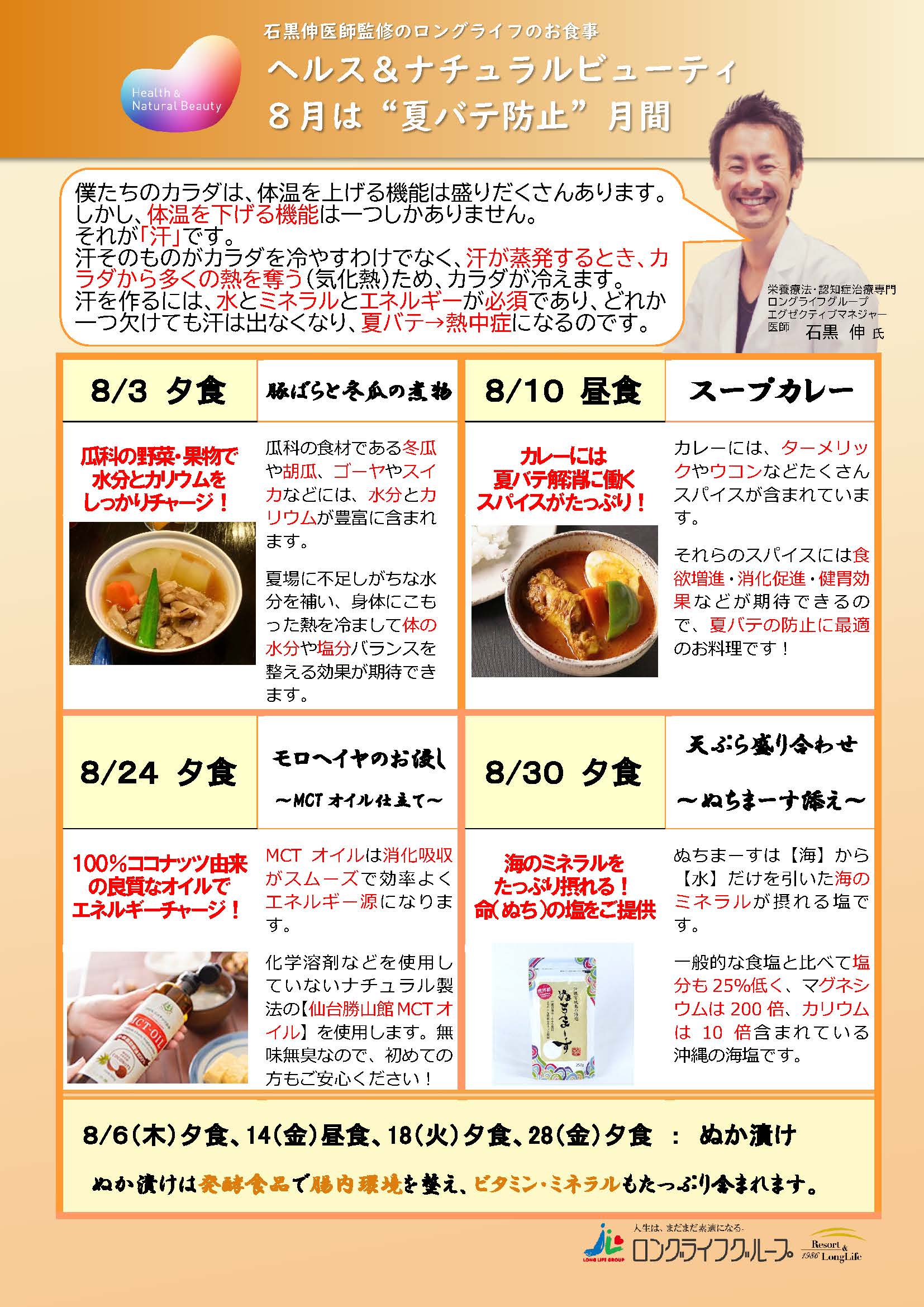 ロングライフグループの新コンセプト「ヘルス&ナチュラルビューティ」フード部門のエグゼクティブマネジャー、石黒伸先生監修の8月のドクターズメニューをご紹介致します。