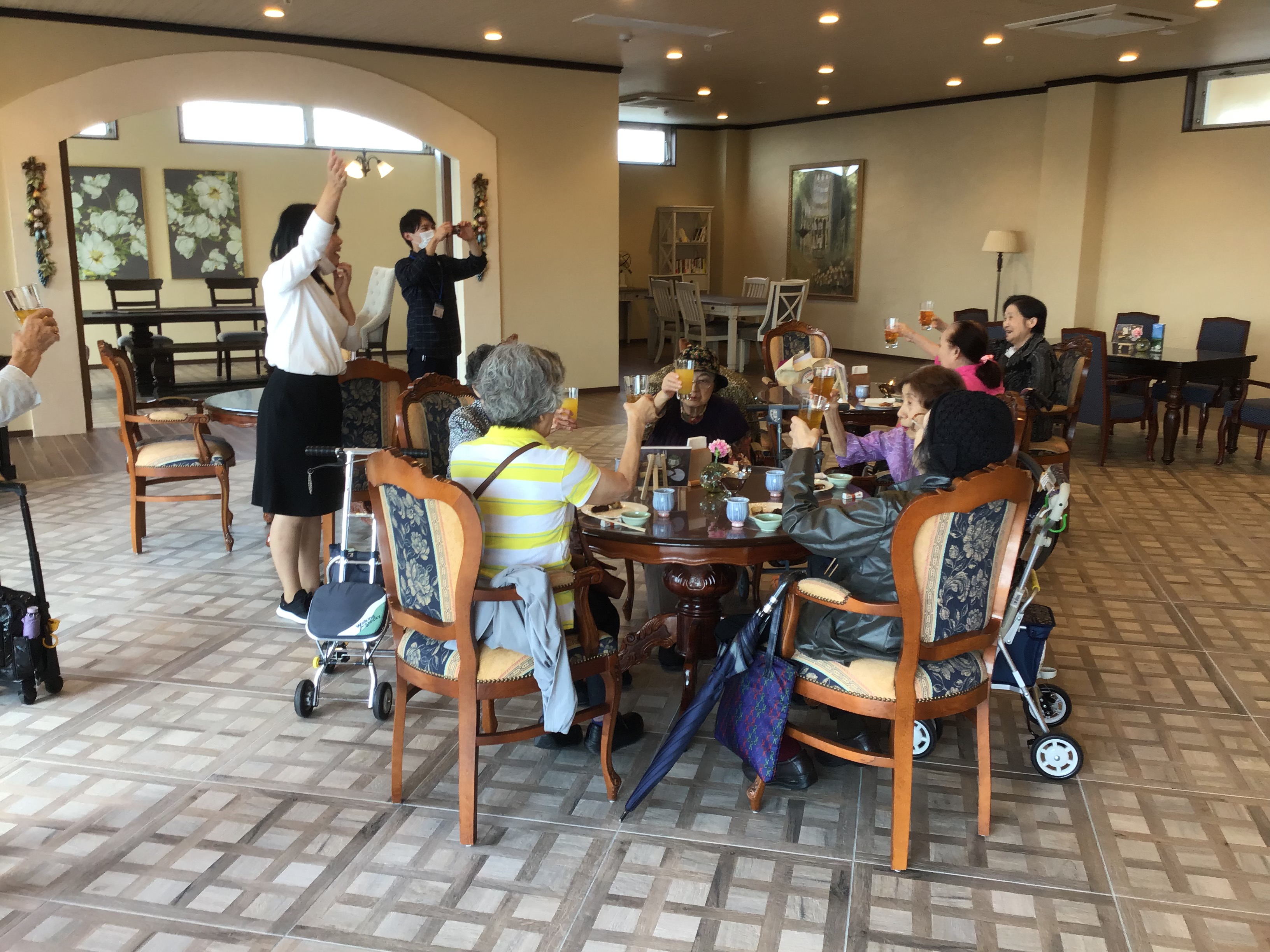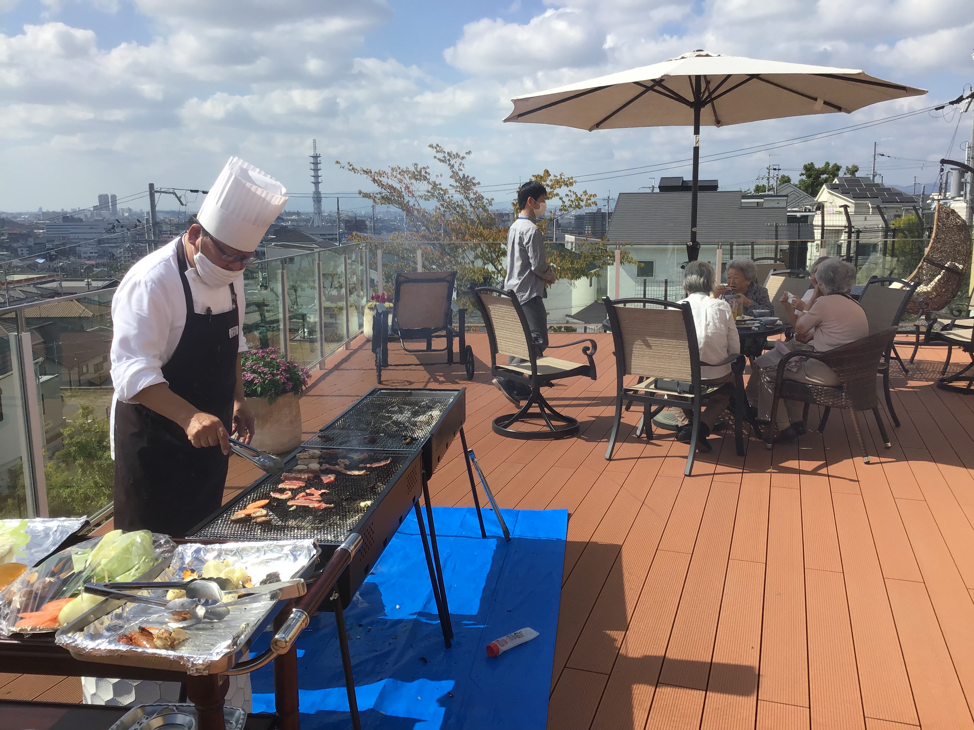 10月14日(水)11時半より、弊社のグループ会社である日本ロングライフ株式会社が運営しております住宅型有料老人ホーム「ロングライフタウン寝屋川公園」で北摂エリアBBQ大会が開催されました。寝屋川にお住まいの6名のお客様と北摂エリアにある「ロングライフみなせ」「グループホームみなせ」「ロングライフ高槻」「ラビアンローズ高槻」からお越しくださった11名のお客様、総勢17名のお客様がご一緒にBBQパーティーをお楽しみになりました。