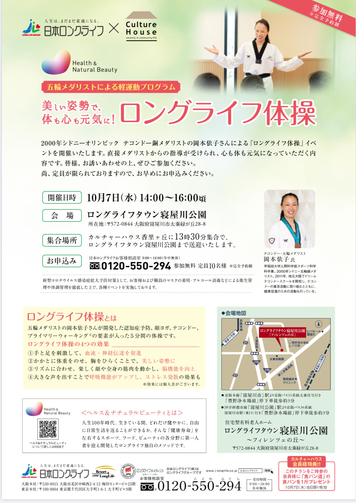 当社のグループ会社である日本ロングライフ株式会社の住宅型有料老人ホーム「ロングライフタウン寝屋川公園」にて、シドニー五輪テコンドー銅メダリストの岡本依子さん(ロングライフホールディング株式会社ヘルス&スポーツ部門 エグゼクティブマネジャー)が、10月7日(水)ロングライフ体操イベント※を行います。完全予約制で先着10名様となります。お申込み、お問い合わせは、日本ロングライフお客様相談室(フリーダイヤル0120-550-294)まで、お願い致します。集合場所はカルチャーハウス香里ケ丘に13時30分集合で、ロングライフタウン寝屋川公園まで送迎致します。詳しくはちらしをご覧ください。