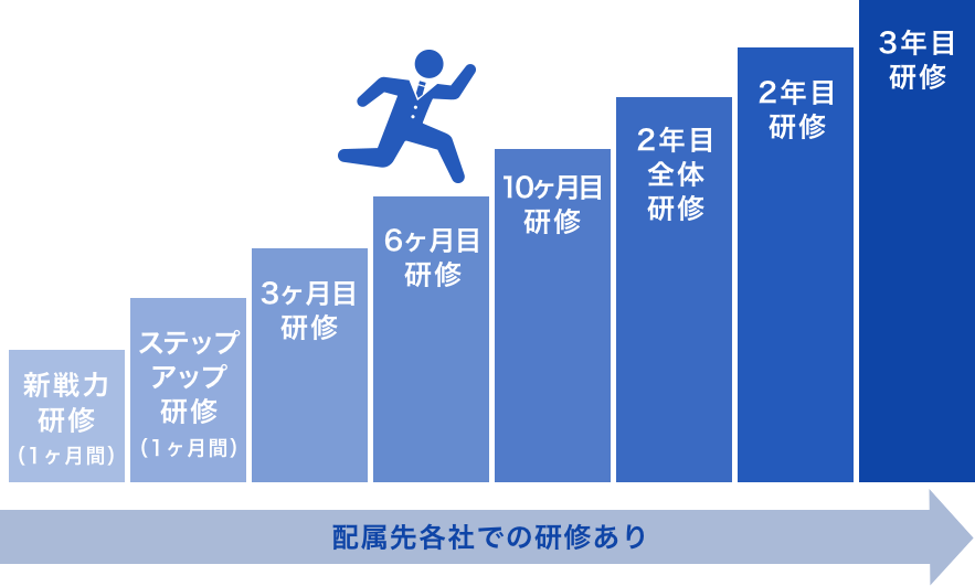 だからこそ、スタッフ一人ひとりの能力やスキルを高めていくことが非常に大切です。入社から3年間、研修専門スタッフがサポートをします。